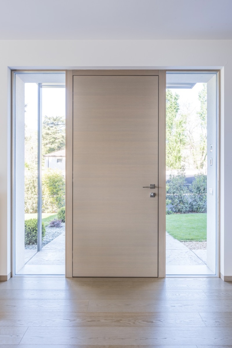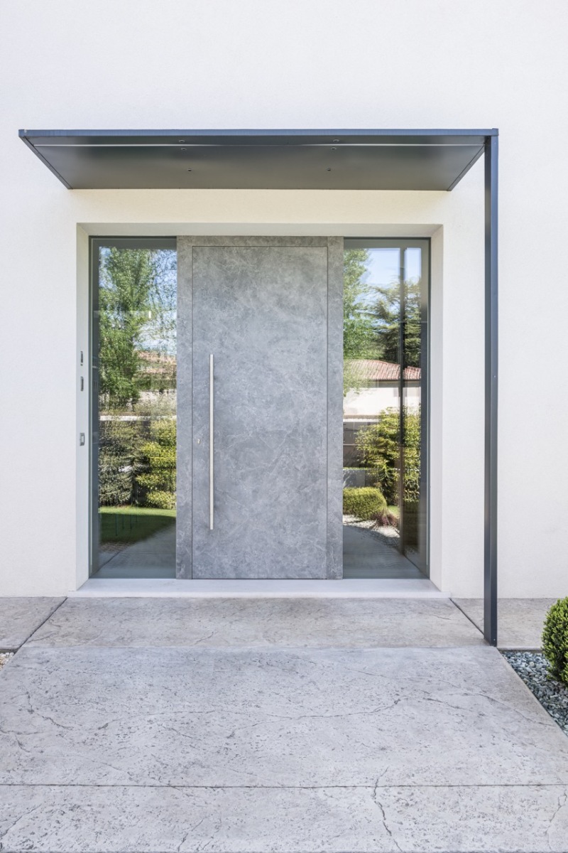 L’ingresso principale è caratterizzato da un’anta con rivestimento esterno in kerlite (gres) e fissi laterali dal design moderno, che aggiungono un tocco di eleganza contemporanea all’architettura.