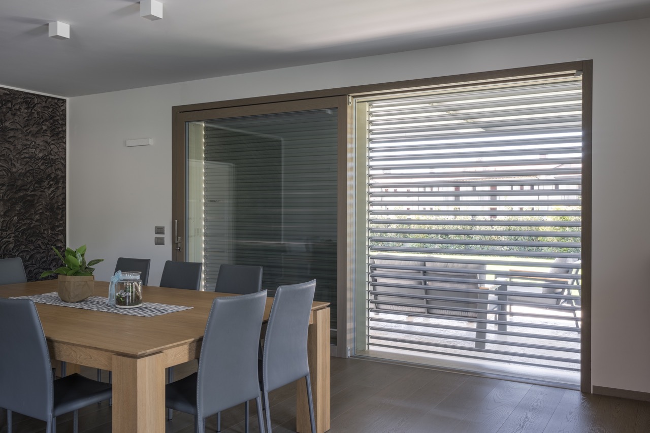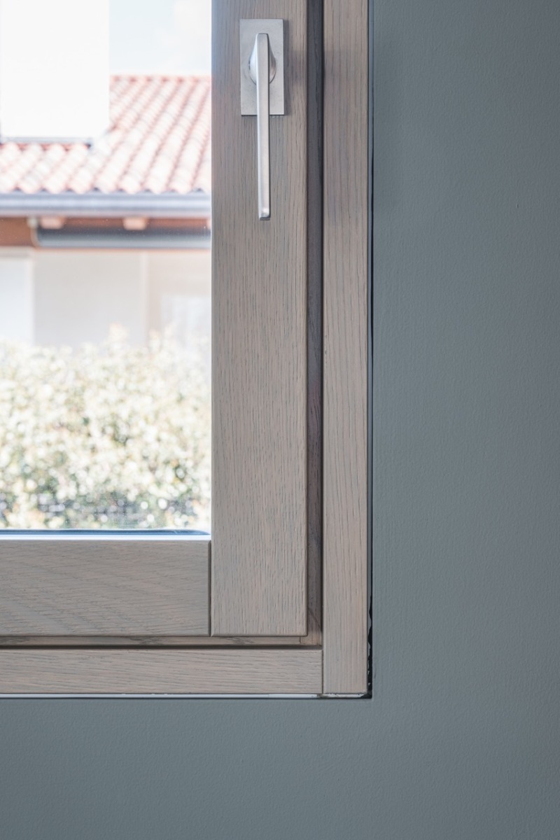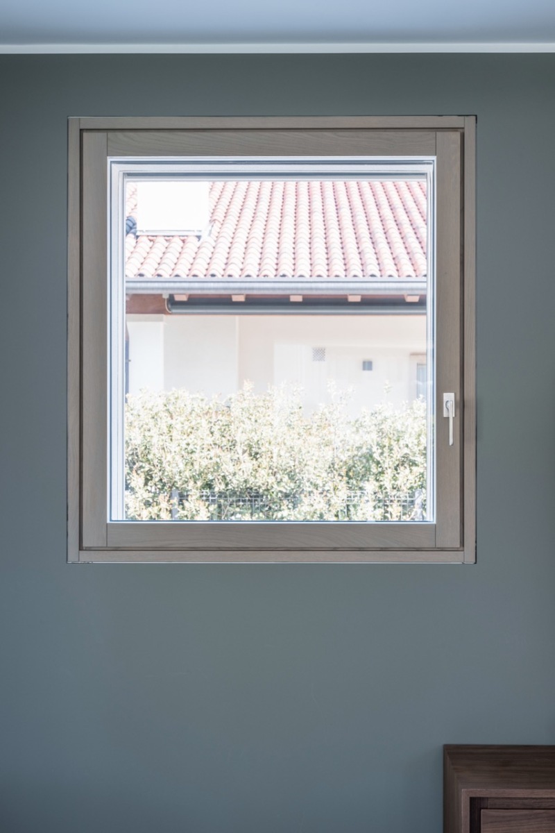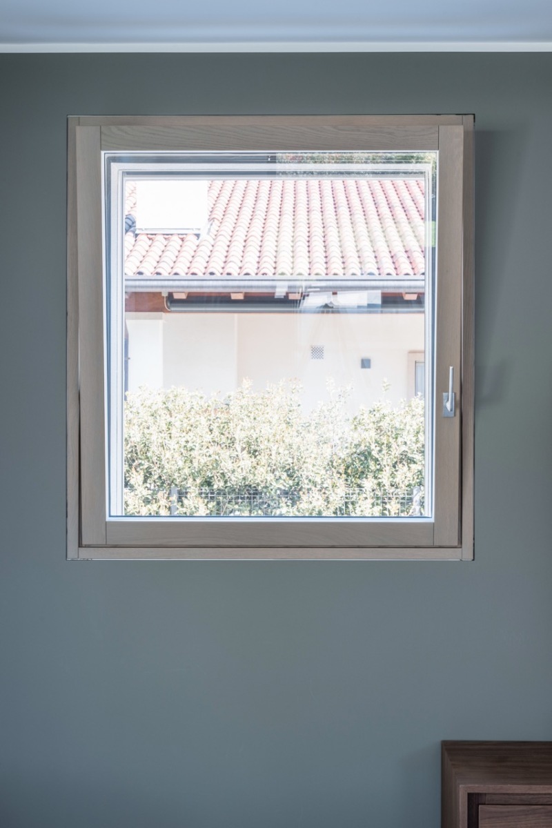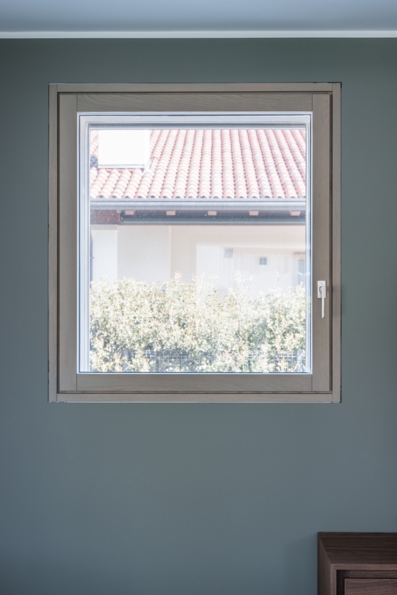 Nel cuore di questo progetto, abbiamo selezionato con cura i materiali per garantire la massima qualità e durata. I serramenti scelti sono del modello Padarigma bicomplanare, con una finitura in rovere spazzolato, tinteggiato su campione per soddisfare i gusti del cliente. Le schermature solari sono state personalizzate in base alle esigenze dell’abitazione, con tende oscuranti al piano superiore e frangisole al piano terra.