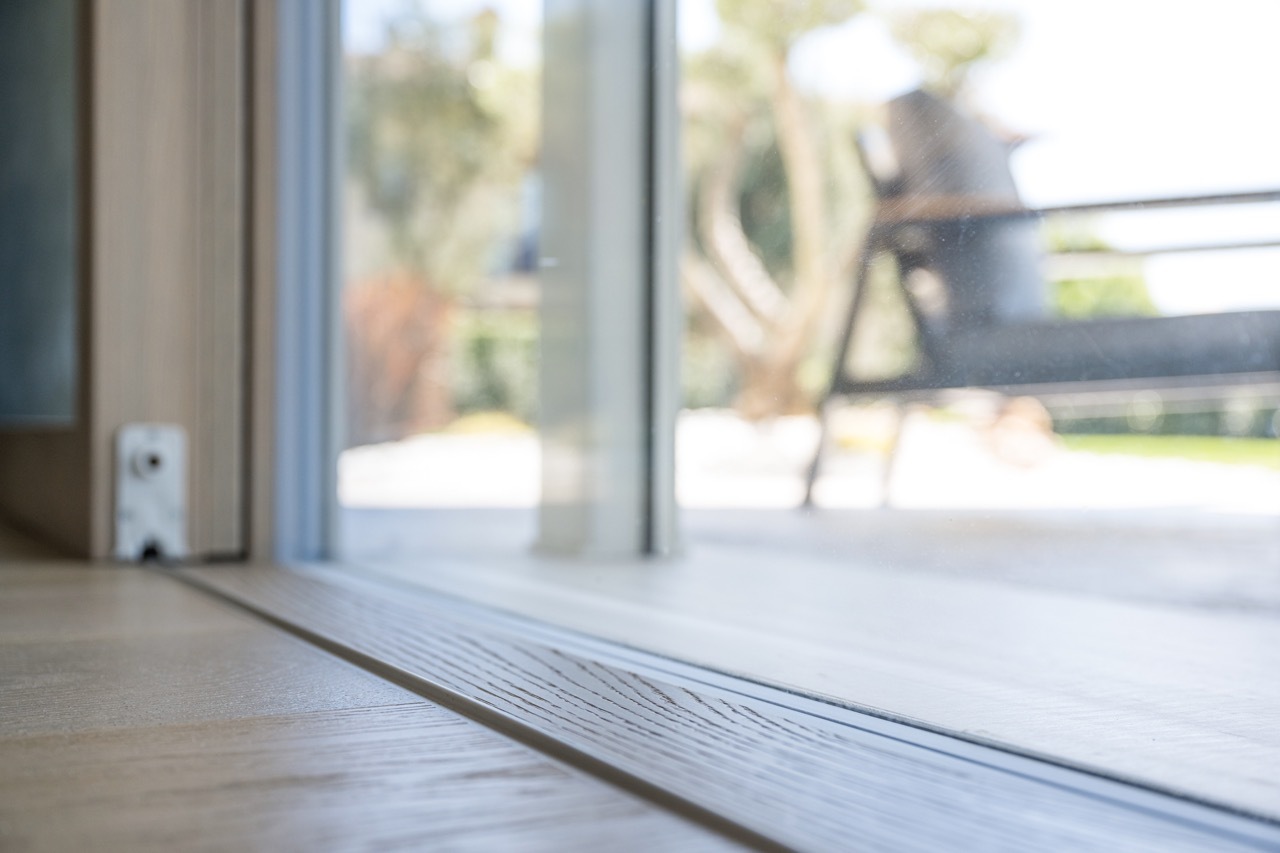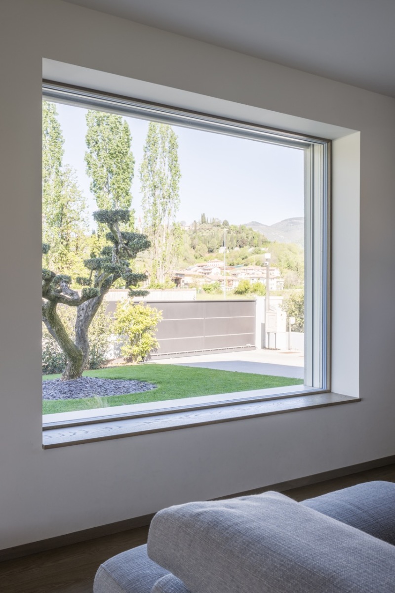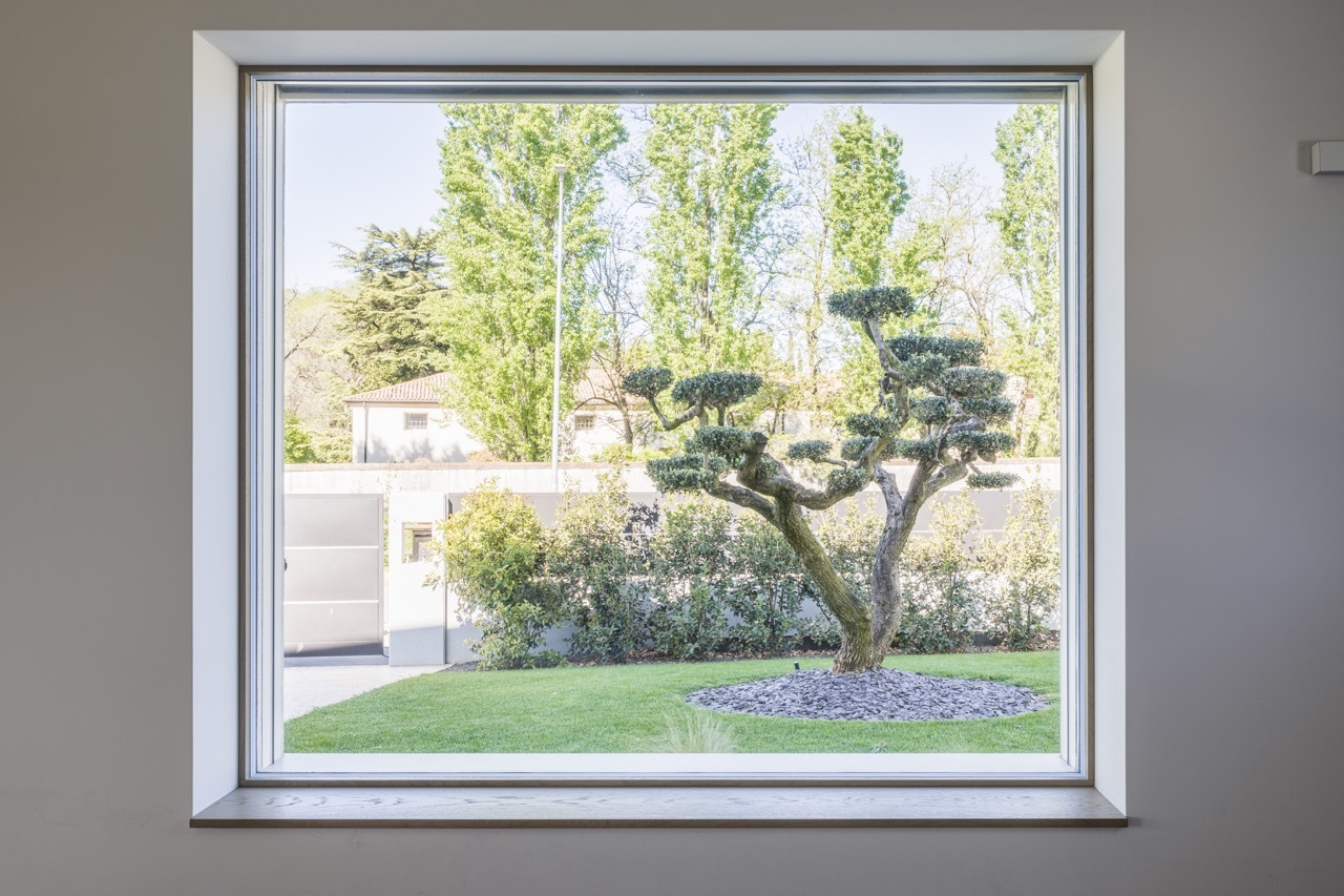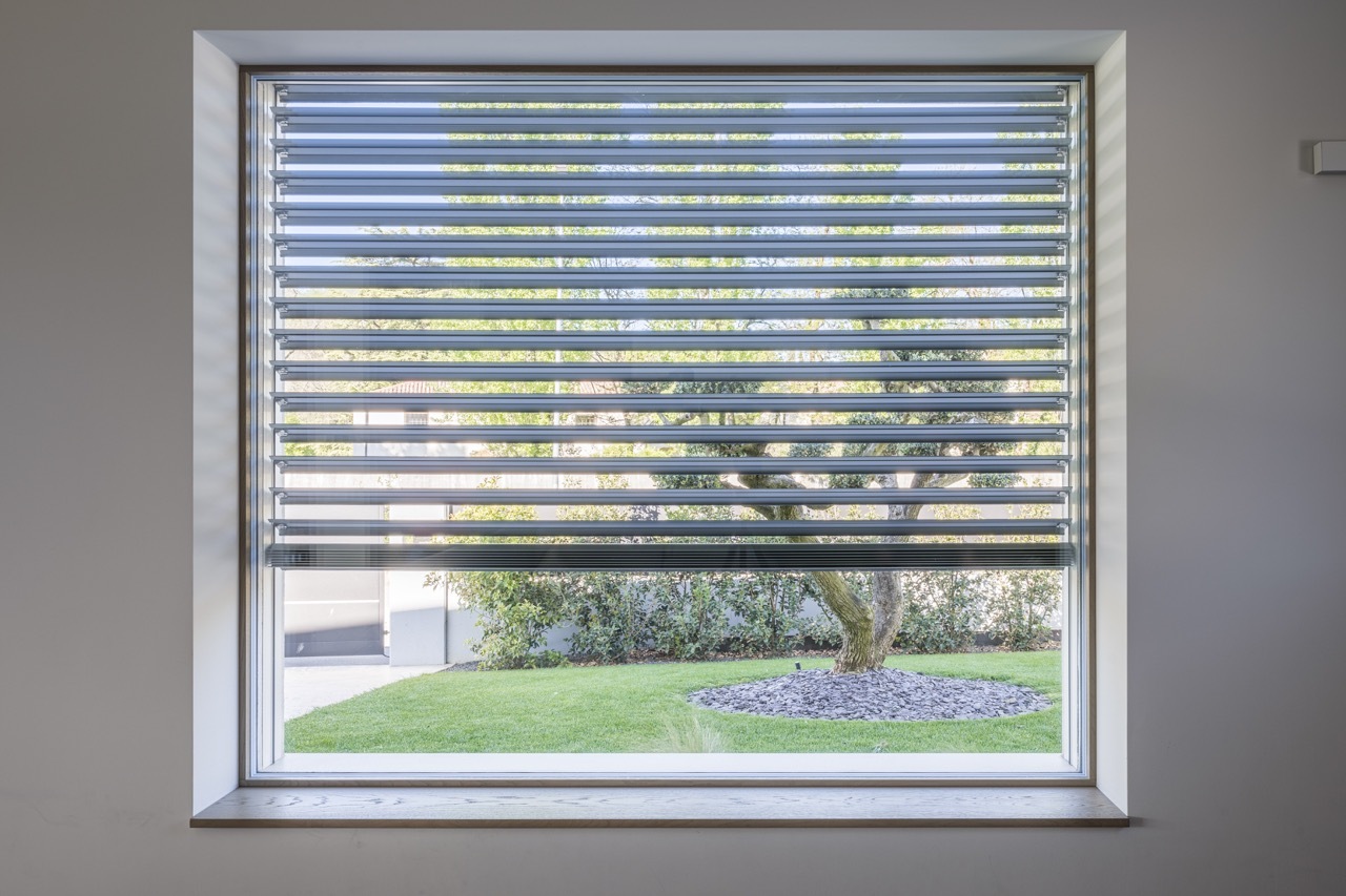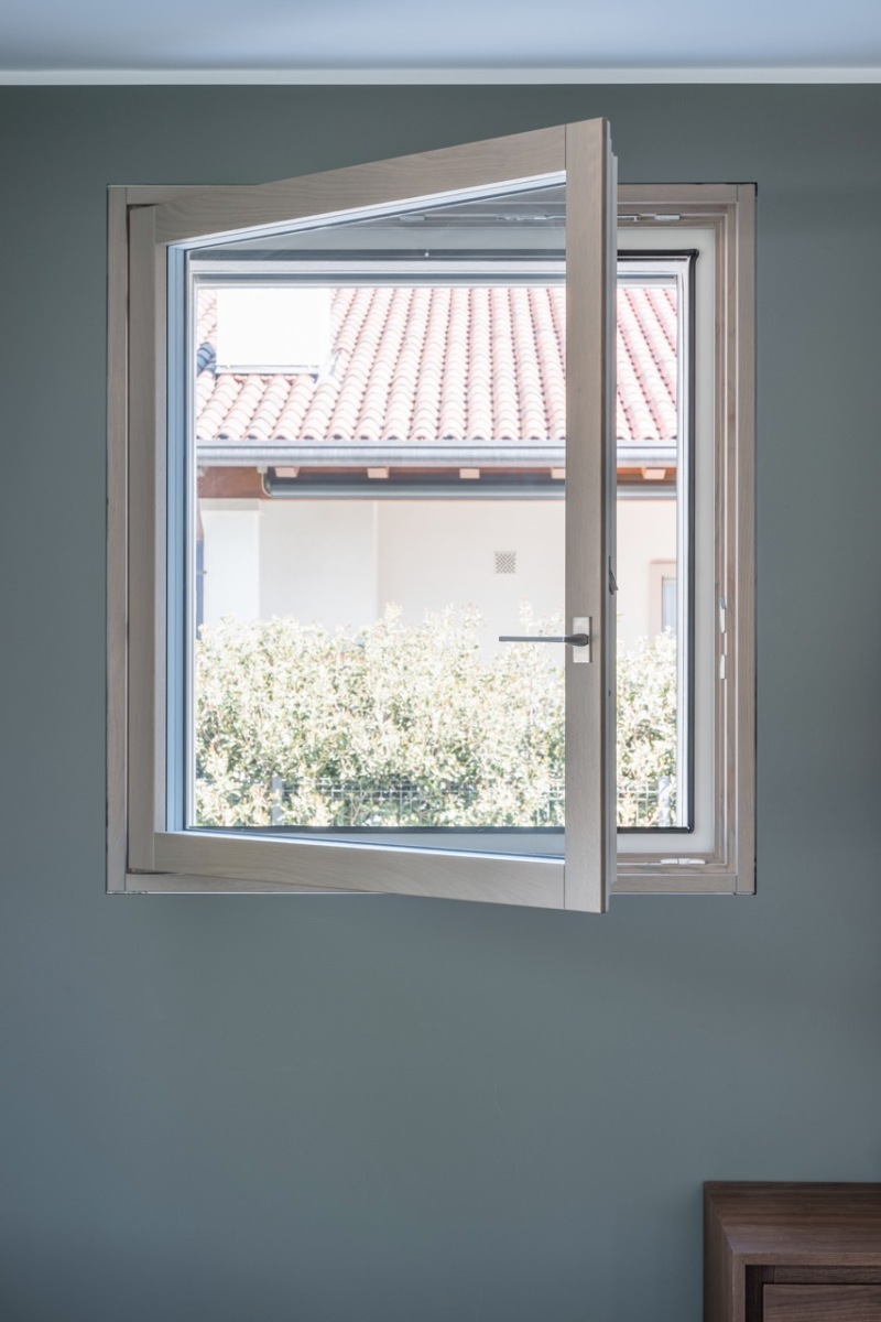 Nel cuore di questo progetto, abbiamo selezionato con cura i materiali per garantire la massima qualità e durata. I serramenti scelti sono del modello Padarigma bicomplanare, con una finitura in rovere spazzolato, tinteggiato su campione per soddisfare i gusti del cliente. Le schermature solari sono state personalizzate in base alle esigenze dell’abitazione, con tende oscuranti al piano superiore e frangisole al piano terra.